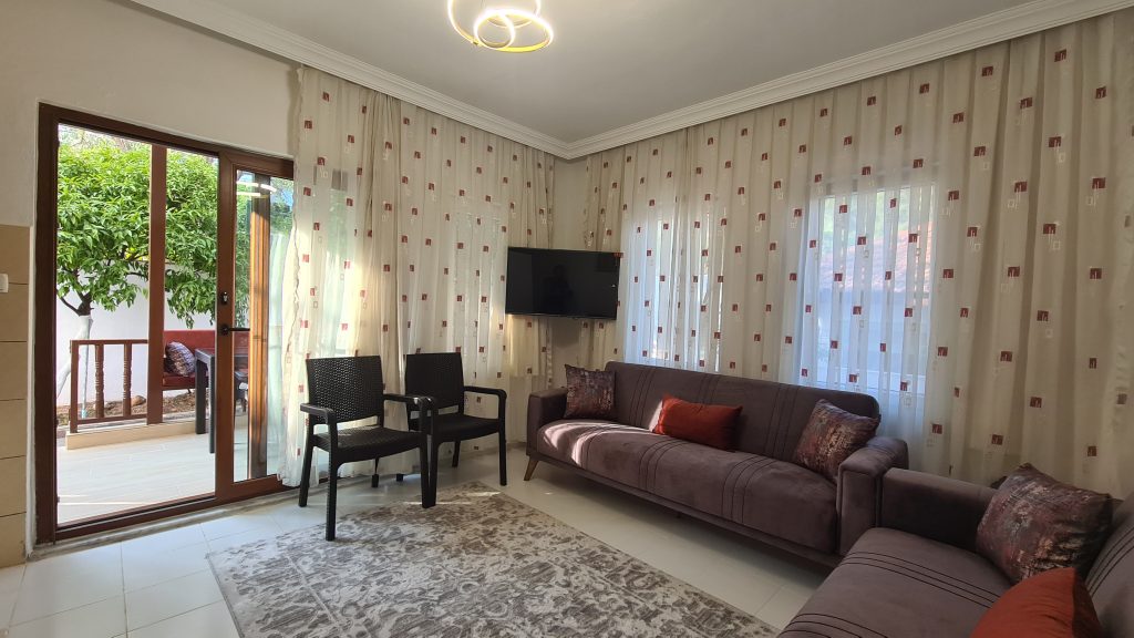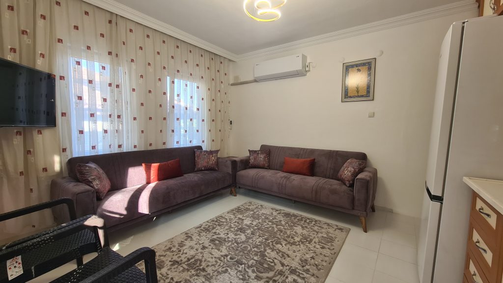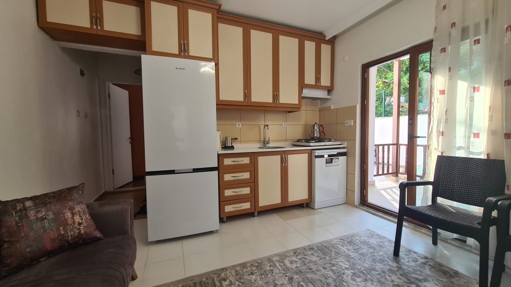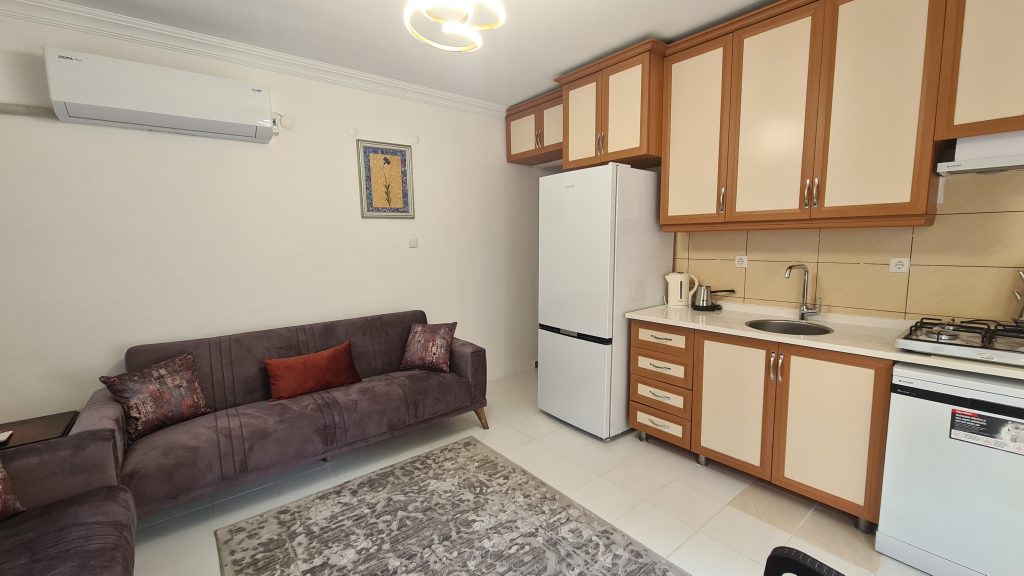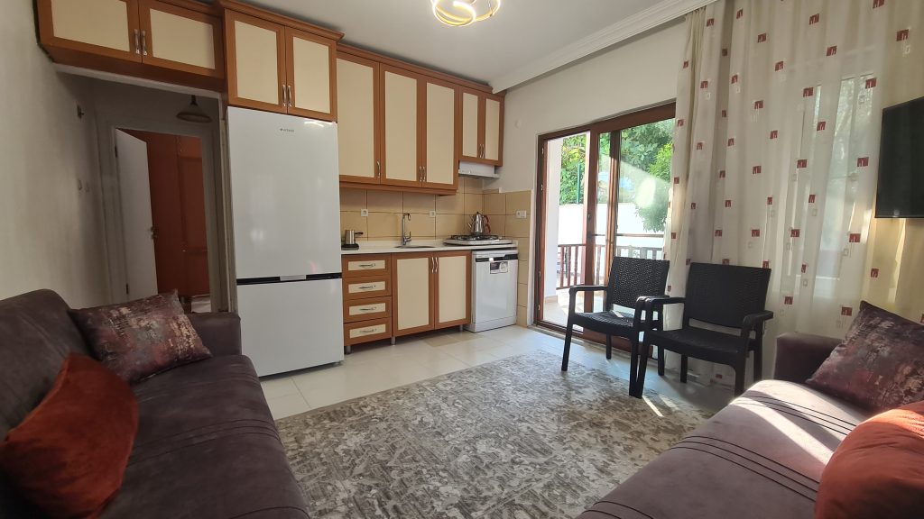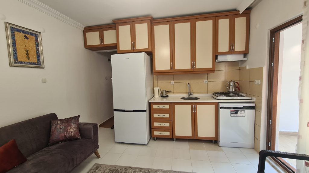 1+1 Küçük Evimizde; - Çift kişilik double yataklı bağımsız bir yatak odası - Açık mutfak salon kısmında iki adet çek-yat bulunmaktadır.